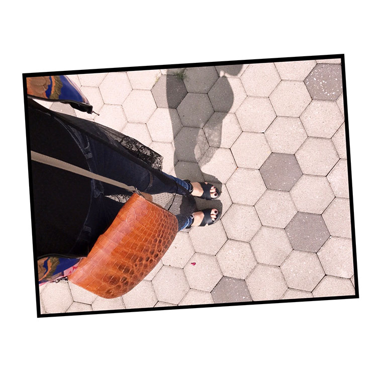 Today I will mix lots of different styles. I wear some destroyed denim pants by Hennes and Mauritz and a black lace-up top as basis. On top I put this cool festival style transparent black lace dress by Coachella for Hennes and Mauritz, so that you can see the denim pants covered with a layer of lace. This makes this outfit look more bohemian. My cool bomber jacket with asian flower print by Zara which I bought some years ago, my black velvet choker and my rose gold colored spikes necklace add some exotic 90s punk style glam-rock attitude to my today’s look. I always loved hoops earrings! Now they are a must-have this and next season again. They give me the power of a latina hip hop queen from the 90s. Love that! To make my outfit of the day look even more unique I wear my 40 year old vintage croco shoulder bag which I got from my mum many years ago. Black wedges complete my look. My hair is put into a half-bun, the perfect hair do to enjoy a walk outside. Wishing you a gorgeous day!